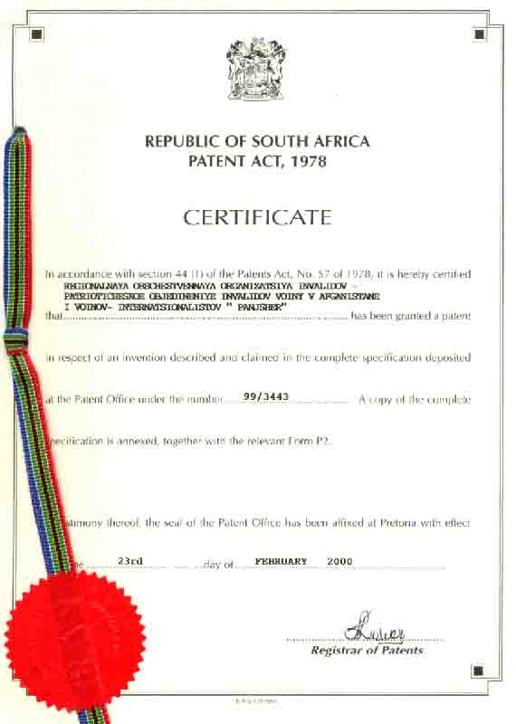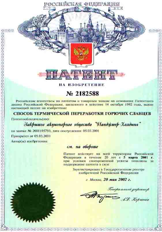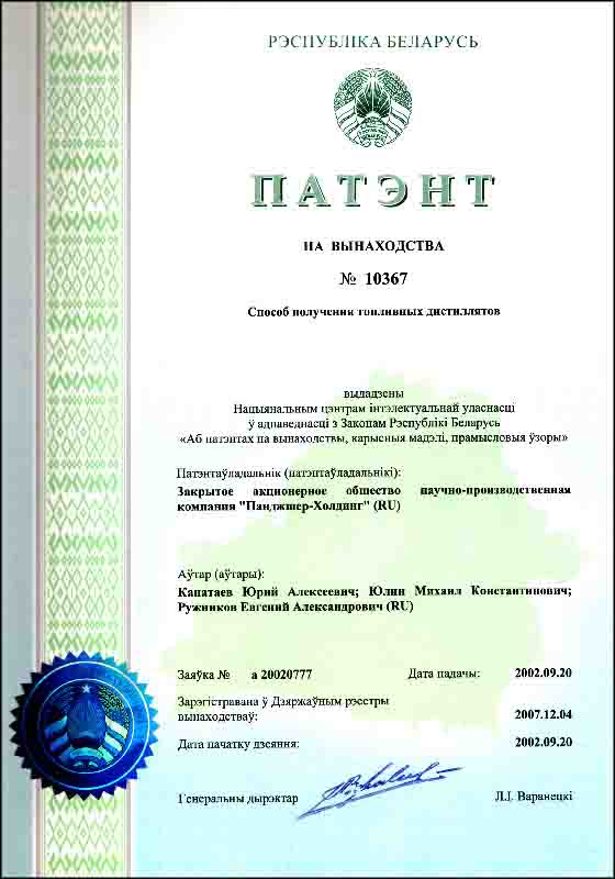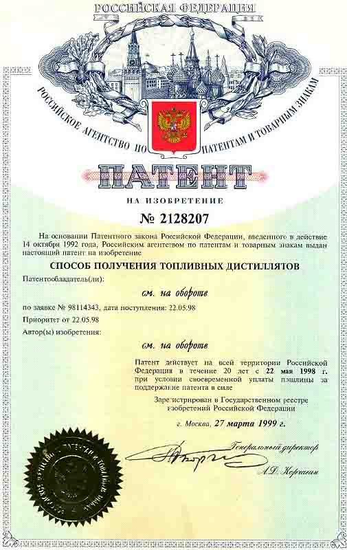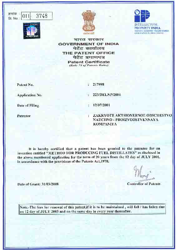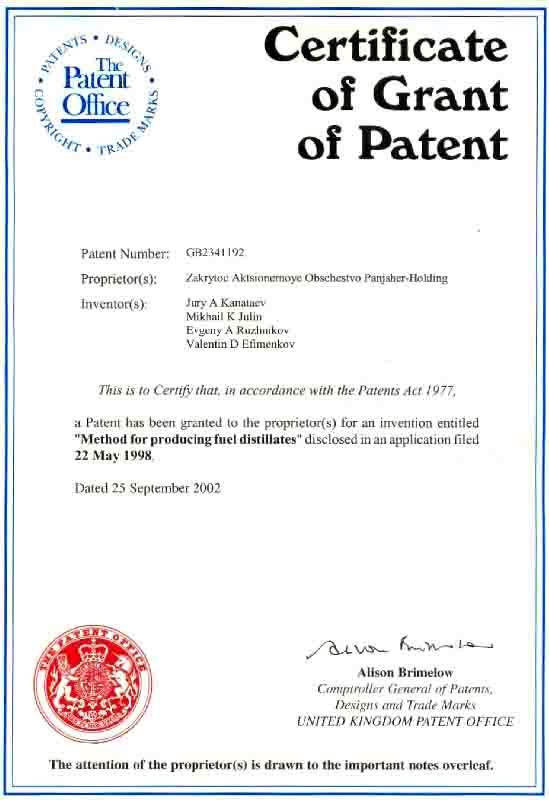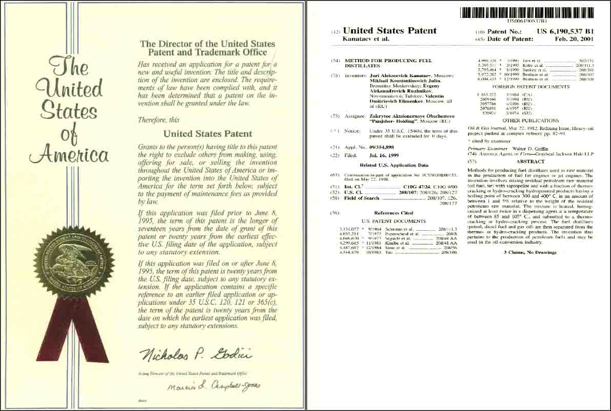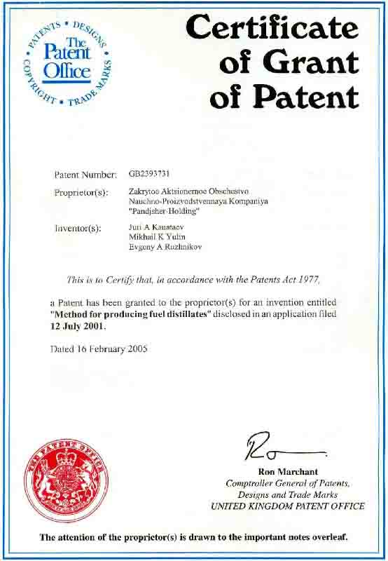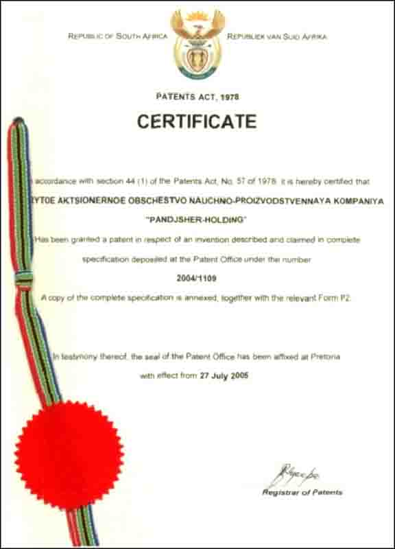 - Компания имеет права на изобретения объектов промышленной собственности, которые защищены Патентами РФ 1994-2007 г.г., а также Патентами ЮАР, США, Великобритании, Китая и Индии 1999-2008гг. Также могут быть представлены следующие изобретения - РФ: № 2009162, 1994г.; № 2009166, 1994г.; № 2128207, 1999г.; № 2182588, 2002г.; № 2198199, 2003г.; № 2261265, 2005г.; № 2297439, 2007г.; США: № US 6,190,537 B1, 2001г.; Великобритании: № GB2341192, 2002г. и № GB2393731, 2005г.; ЮАР: № 99/3443, 1999г. и № 2004/1109, 2005г.; Китая: № 108819, 2003г. и № ZL 01823628.6, 2006г.; Белоруссии: №10367, 2007г.; Индии: № 217998, 2008г.